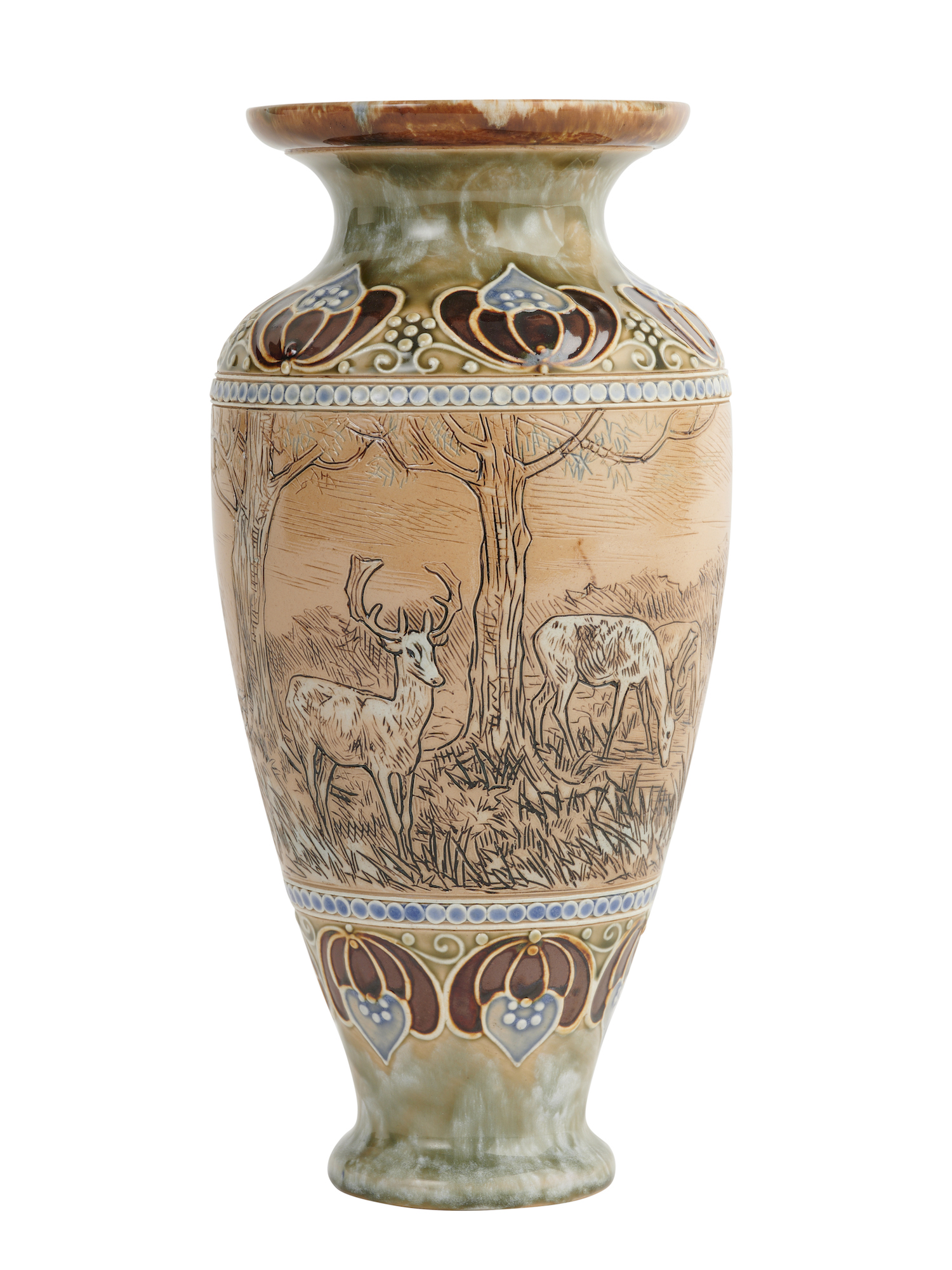 Baluster in form, the central band with sgraffito scene of deer and doe in landscape setting, incised markers mark and impressed circle, lion and crown factory mark to underside of base, together with other impressed and incised marks