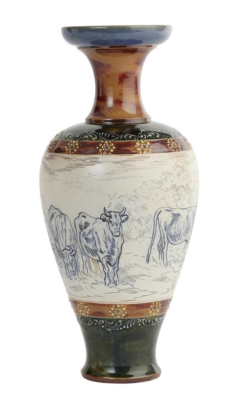 Baluster in form, the central band decorated with a sgraffito scene of cattle in landscape, incised markers mark and impressed rosette England factory mark to underside of base, together with other impressed and incised marks