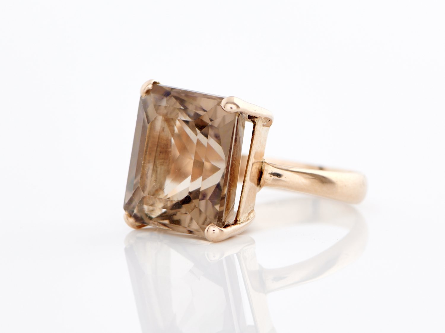 AN EMERALD CUT CITRINE RING IN 18CT ROSE GOLD, RING SIZE M, THE CITRINE OF APPOXIMATELY 12CTS, 6.1GMS