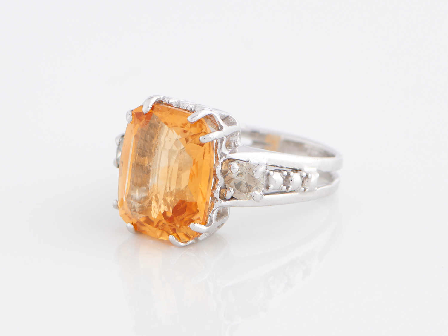 A CITRINE AND DIAMOND RING IN 18CT WHITE GOLD, THE CITRINE WEIGHING 6.65CT, RING SIZE K 1/2
