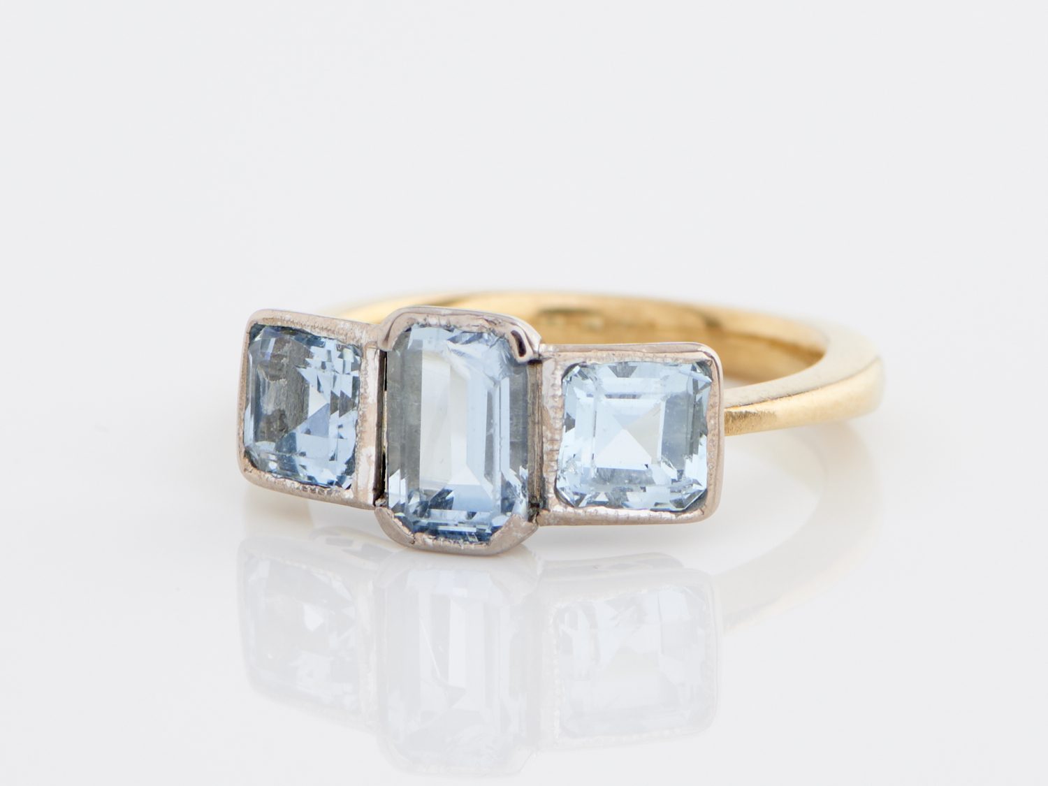 AN AQUAMARINE THREE STONE IN 18CT TWO TONE GOLD, RING SIZE N 1/2, 5.2GMS