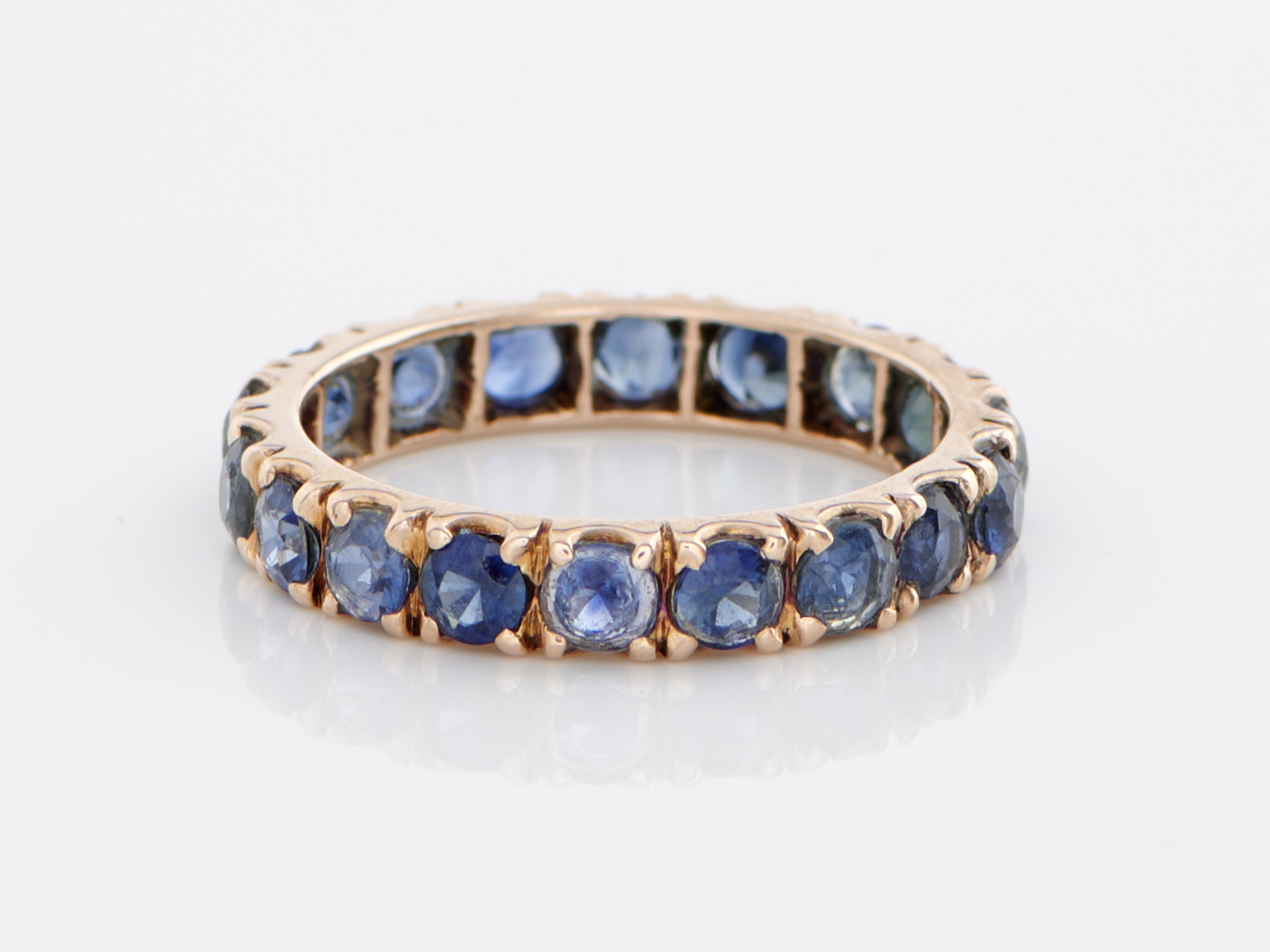 A SAPPHIRE SET ETERNITY RING IN 9CT ROSE GOLD, RING SIZE M, 2.2GMS