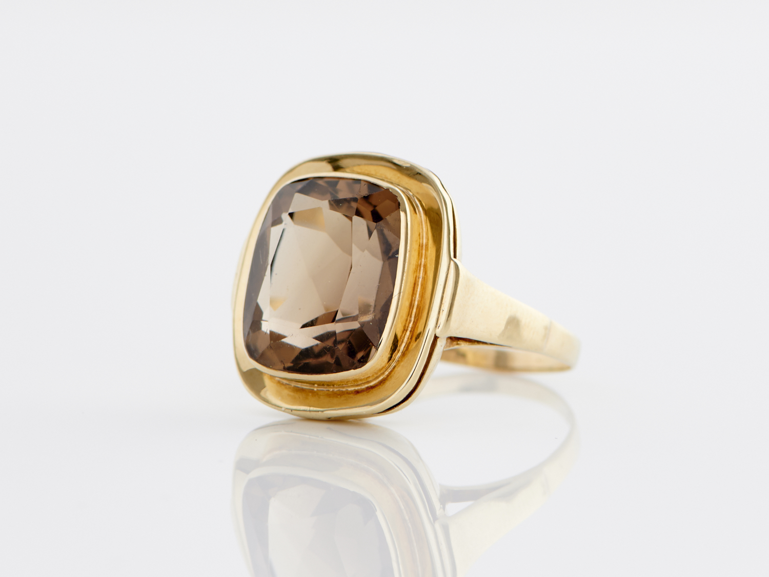 A SMOKEY QUARTZ RING IN 14CT GOLD, THE SMOKEY QUARTZ OF 7.0CTS, RING SIZE Q1/2, 4.68GMS