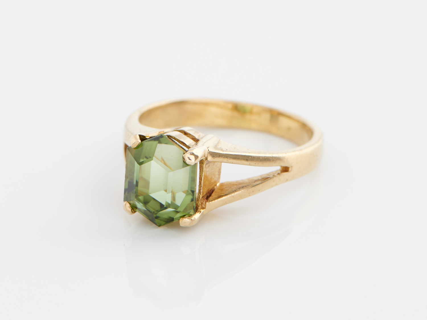 A GREEN TOURMALINE RING IN 18CT GOLD, RING SIZE G, 3.3GMS