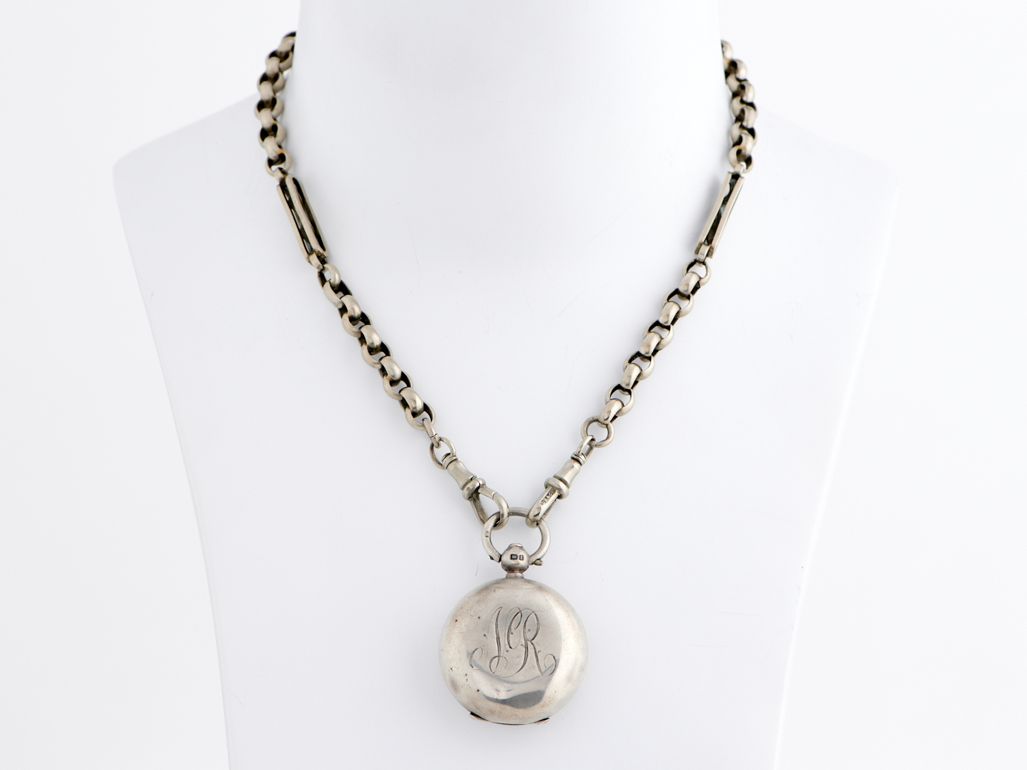 AN ANTIQUE SOVEREIGN CASE TO FOB CHAIN IN STERLING SILVER, LENGTH 400MM
