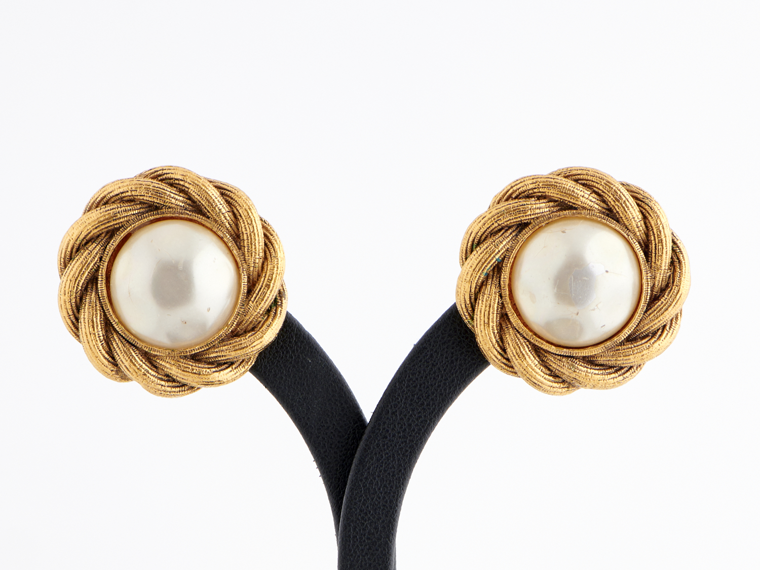 CHANEL, A PAIR OF VINTAGE EARRINGS IN GOLD PLATED METAL, FEATURING FAUX PEARL DETAIL, TO CLIP ON FITTINGS, CIRCA 1980'S