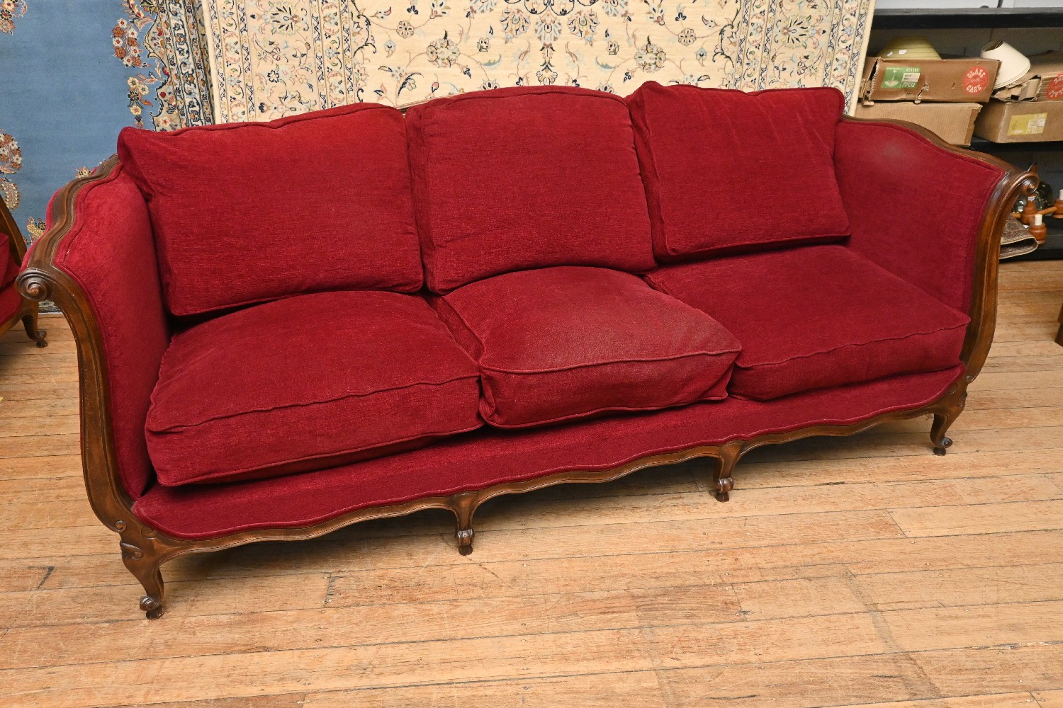 A FRENCH LOUIS XV STYLE UPHOLSTERED THREE SEATER LOUNGE (A/F) (88H X 219W X 93D CM) (PLEASE NOTE THIS HEAVY ITEM MUST BE REMOVED BY CARRIERS AT THE CUSTOMER'S EXPENSE. LEONARD JOEL STAFF CANNOT ASSIST CARRYING THIS ITEM) (X-LARGE ITEM)