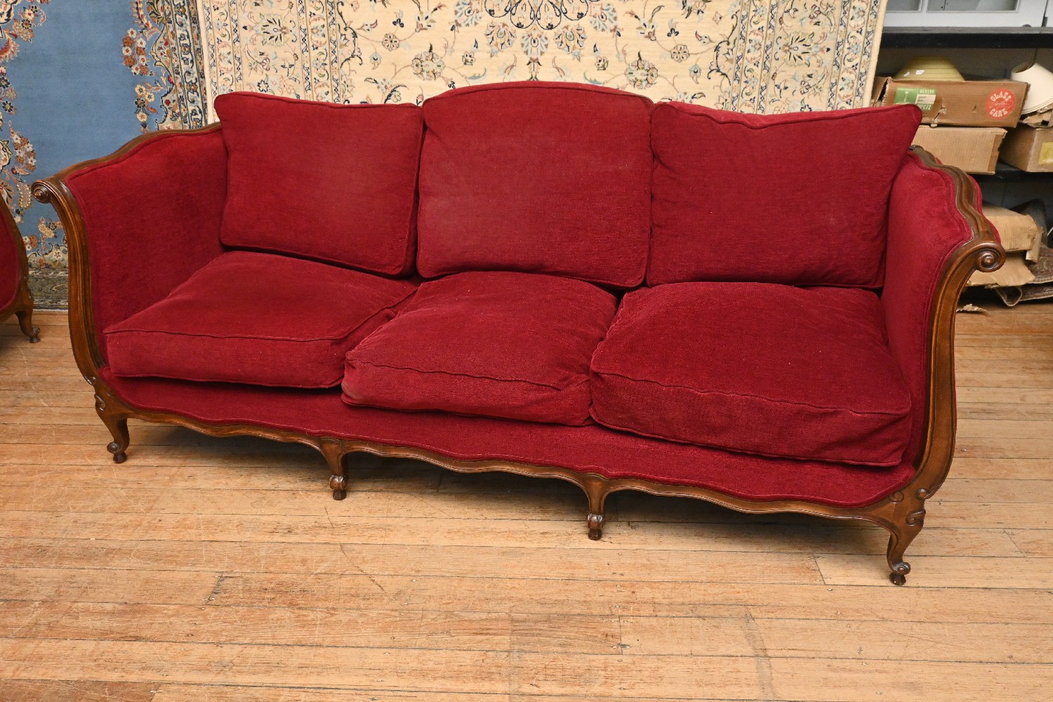 A FRENCH LOUIS XV STYLE UPHOLSTERED THREE SEATER SOFA (A/F) (88H X 219W X 93D CM) (PLEASE NOTE THIS HEAVY ITEM MUST BE REMOVED BY CARRIERS AT THE CUSTOMER'S EXPENSE. LEONARD JOEL STAFF CANNOT ASSIST CARRYING THIS ITEM) (X-LARGE ITEM)