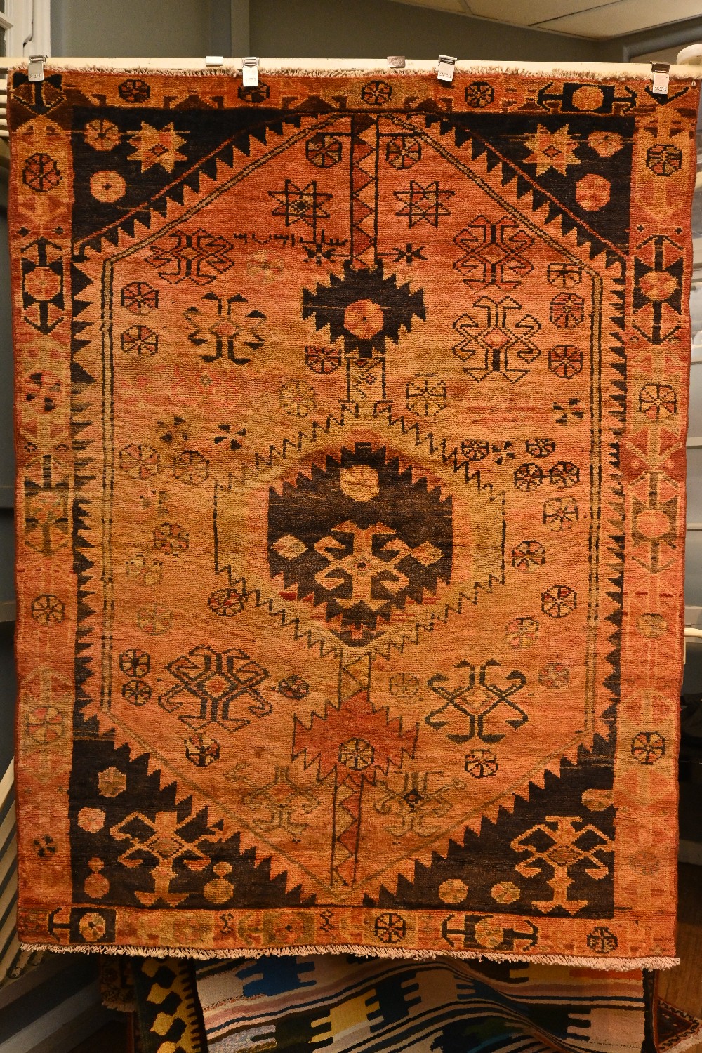 A TRIBAL PERSIAN LURI RUG. 100% WOOL. NATURAL DYES, SEMI VINTAGE PILE. HAND-KNOTTED TRIBAL WEAVE WITH DESIGN OF CENTRAL HEXAGONAL MEDALLION CONTAINING TRIBAL MOTIFS ON A BURNT ORANGE FIELD WITH ALL OVER STAR AND ROSETTES. BORDER OF GEOMETRIC PATTERNS. SIZE: 190 X 146 CM. ORIGIN: PERSIA - RRP: $1,300. DOCUMENTATION OF AUTHENTICITY INCLUDED