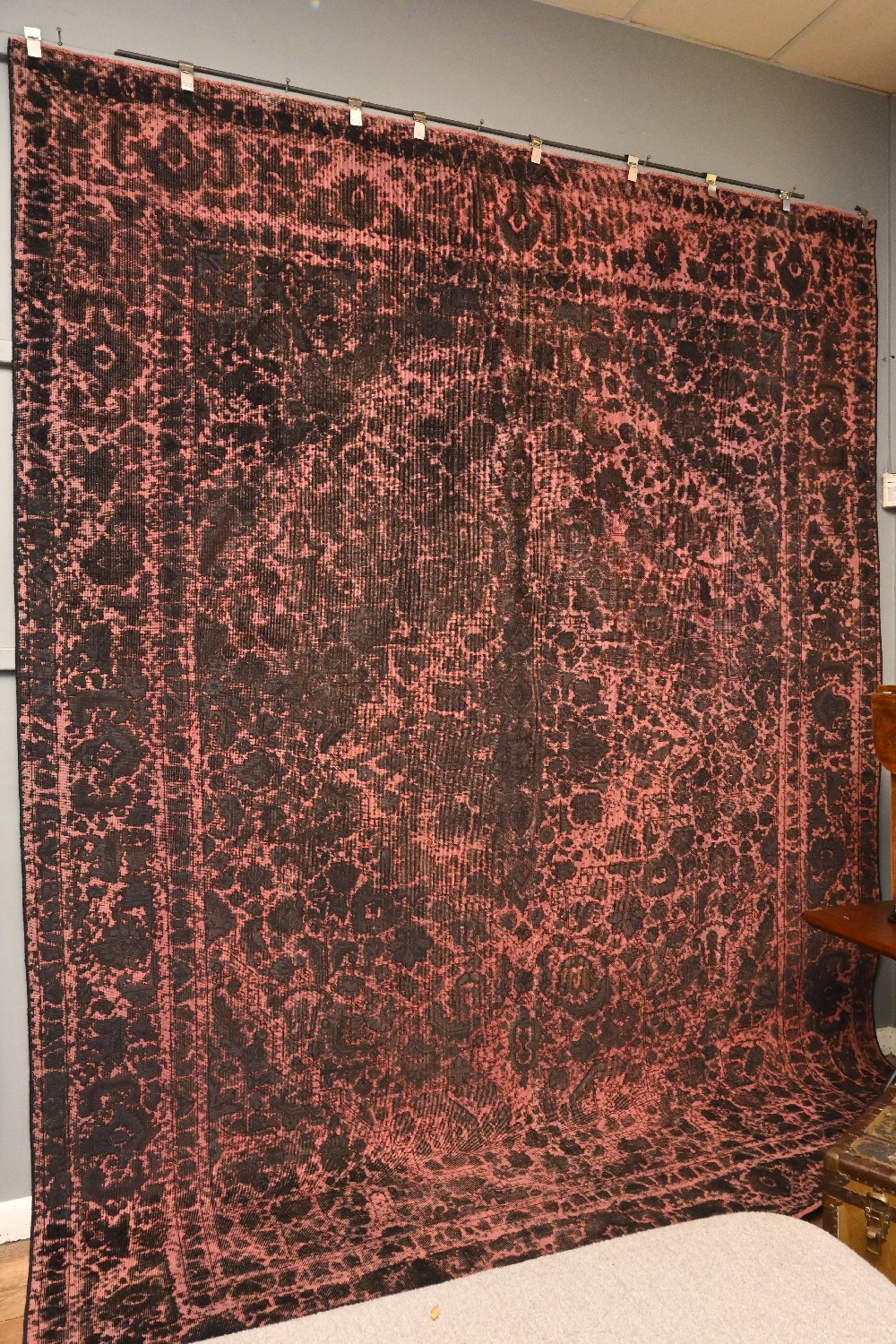 A VINTAGE OVER-DYED PERSIAN TABRIZ CARPET, ANTIQUE STYLE VINTAGE PILE. A UNIQUE MODERN CARPET CREATED FROM AN AUTHENTIC VINTAGE ALL-OVER DESIGN TABRIZ CARPET WITH THE PILE SHORN AND OVER-DYED IN CHARCOAL AND ROSE TONES. SIZE: 383 X 291 CM. ORIGIN: PERSIA - RRP: $4,500. DOCUMENTATION OF AUTHENTICITY INCLUDED