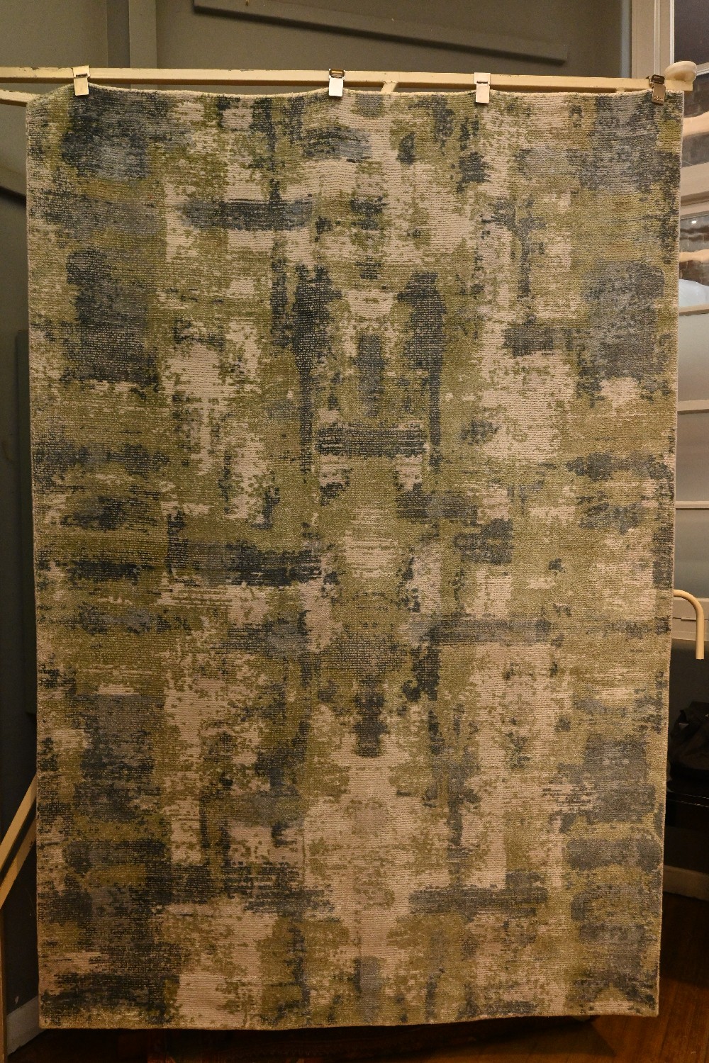 A NEW MODERN RUG. HANDLOOMED. WOOL AND SILKY TEXTURE. IN TONES OF BLUE/GREEN AND IVORY. ORIGIN: INDIA -SIZE: 225 X 152 CM