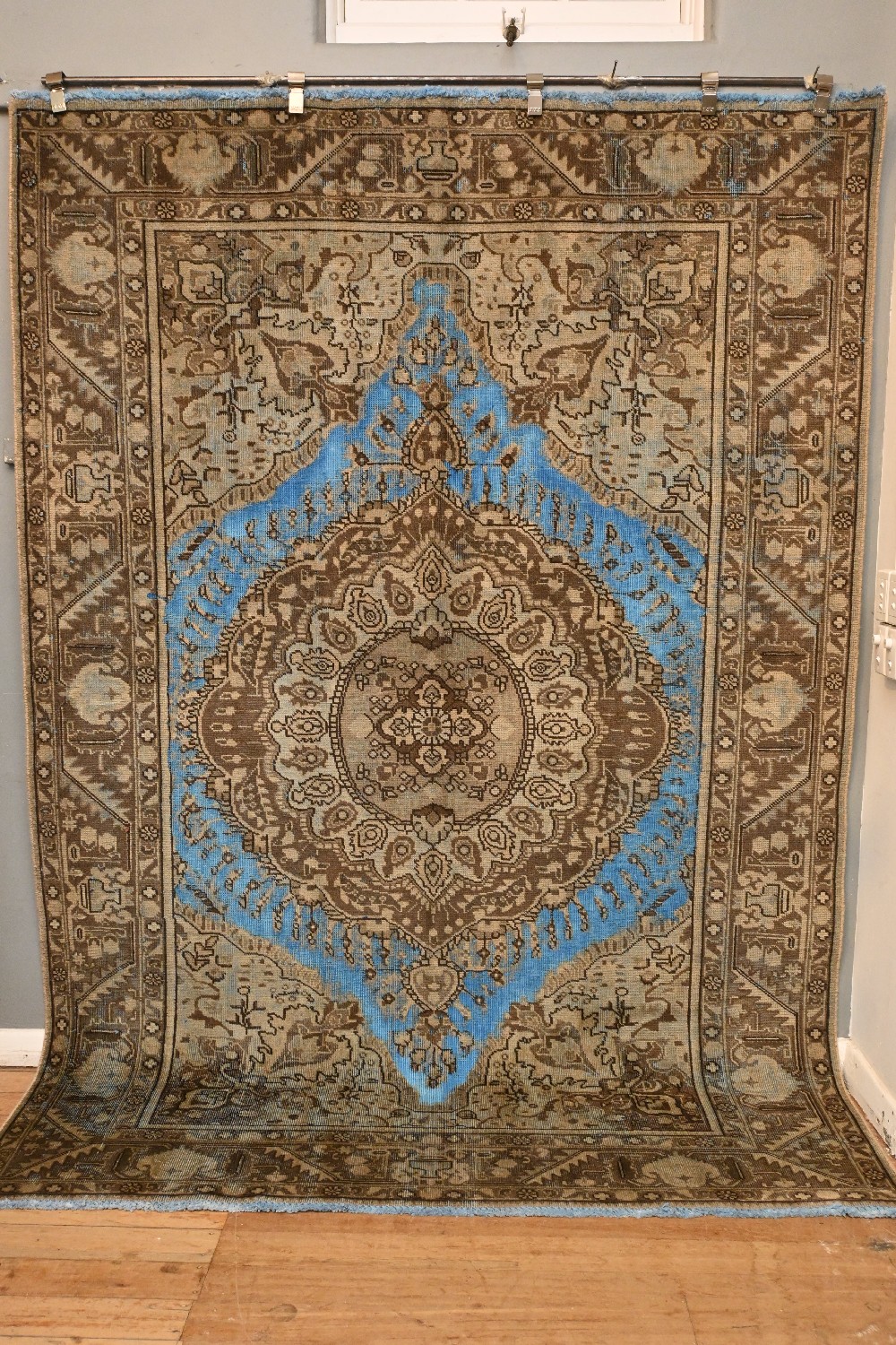 A VINTAGE PERSIAN TABRIZ RUG, 100% WOOL. WITH A UNIQUE CENTRAL MEDALLION SURROUNDED BY A LIGHT BLUE BORDER ON A FIELD OF TABRIZ DESIGN MOTIFS. SIZE: 290 X 200 CM. ORIGIN: PERSIA - RRP: $2,700. DOCUMENTATION OF AUTHENTICITY INCLUDED