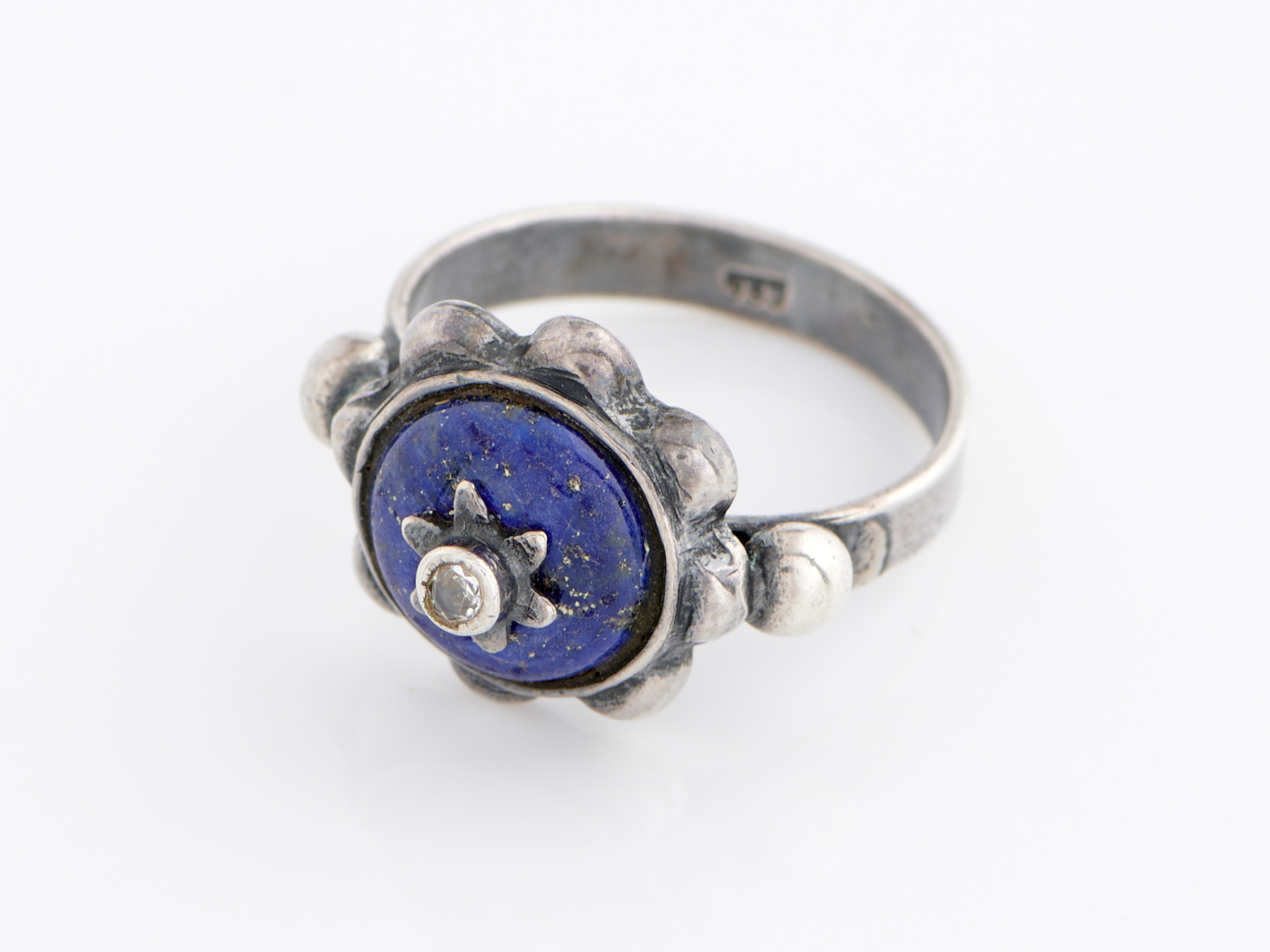 A LAPIS LAZULI AND DIAMOND SET RING IN SILVER, RING SIZE M