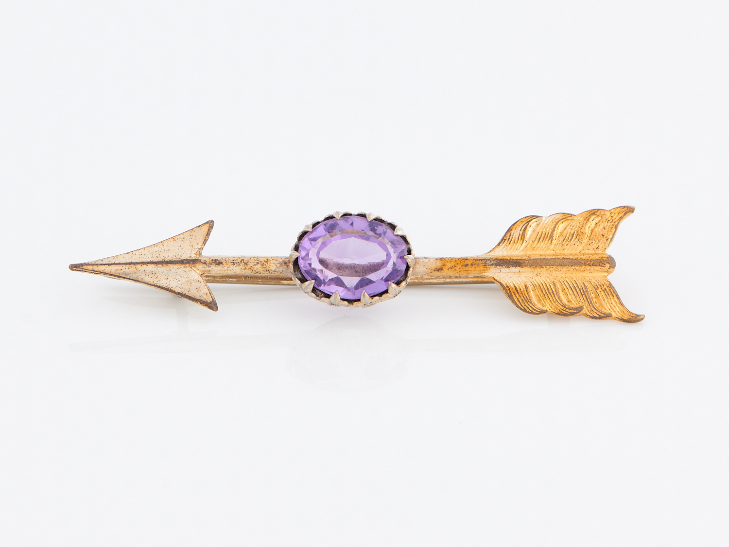 AN ARROW FORM BROOCH IN SILVER GILT, SET WITH AN OVAL CUT AMETHYST, LENGTH 60MM