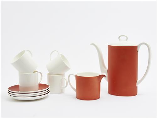 A SUSIE COOPER WEDGWOOD PIMENTO COFFEE SET FOR FOUR H.20CM (TALLEST), LEONARD JOEL LOCAL DELIVERY: SMALL