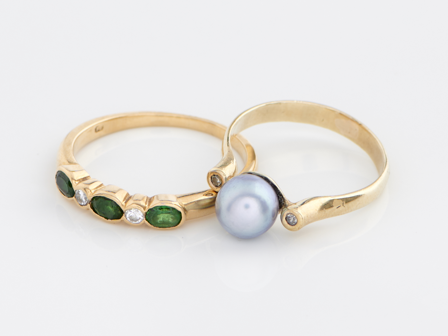 AN EMERALD AND DIAMOND RING IN 18CT GOLD (3.4GMS), RING SIZE R 1/2, TOGETHER WITH A PEARL AND DIAMOND RING IN 9CT GOLD (2.1GMS), RING SIZE N