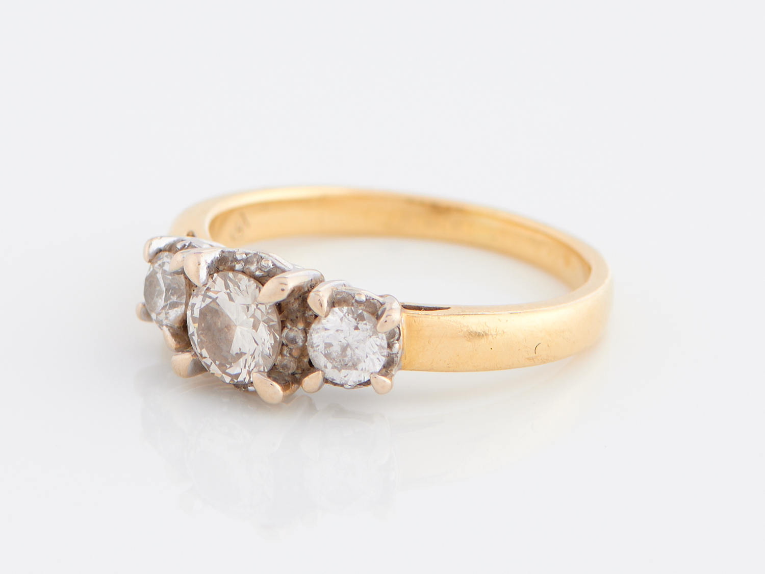 A THREE STONE DIAMOND RING IN 18CT GOLD, RING SIZE M, 4.2GMS