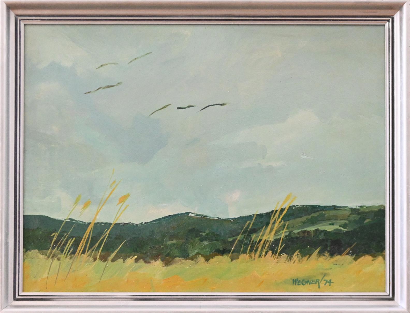 PETER WEGNER, UNTITLED (LYSTERFIELD) 1974, OIL ON BOARD, SIGNED AND DATED LOWER RIGHT, 44 X 59CM, FRAME SIZE: 52 X 67CM