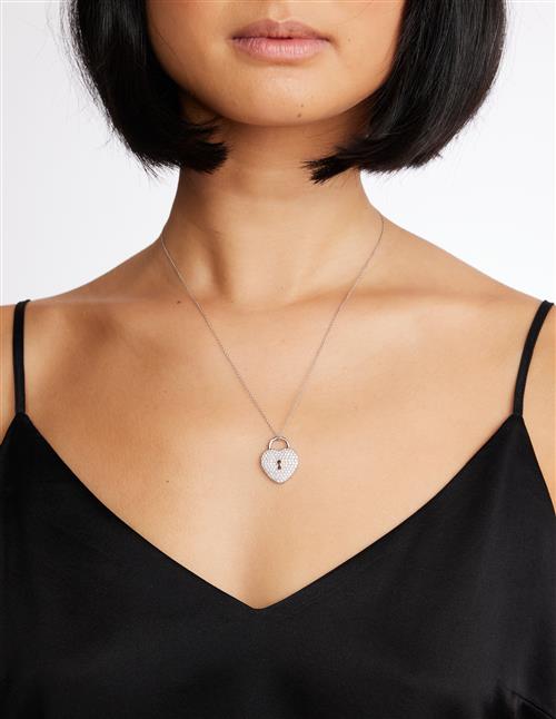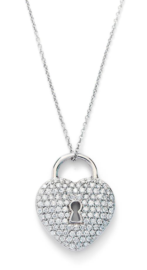 Modelled as a heart shaped padlock, pavé-set to the front with brilliant-cut diamonds, supported from a trace chain, the diamonds together weighing approximately 0.50 carats, mounted in platinum, pendant length 23mm, inner circumference 450mm, signed Tiffany & Co.