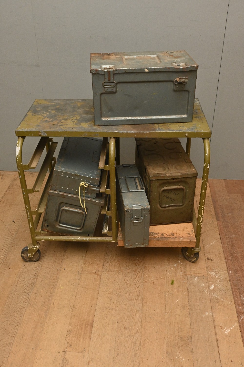 A VINTAGE METAL TROLLEY WITH AMMUNITION BOXES (72H X 84W X 59D CM) (LEONARD JOEL DELIVERY SIZE: X-LARGE)