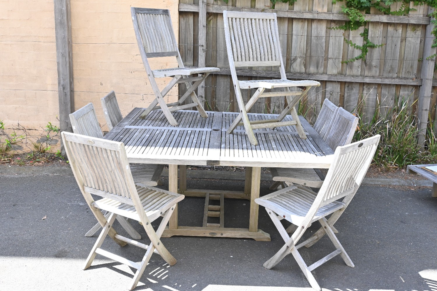 A TEAK NINE PIECE OUTDOOR SETTING (A/F) (73H X 160W X 160D CM) (PLEASE NOTE THIS HEAVY ITEM MUST BE REMOVED BY CARRIERS AT THE CUSTOMER'S EXPENSE. LEONARD JOEL STAFF CANNOT ASSIST CARRYING THIS ITEM) (X-LARGE ITEM)