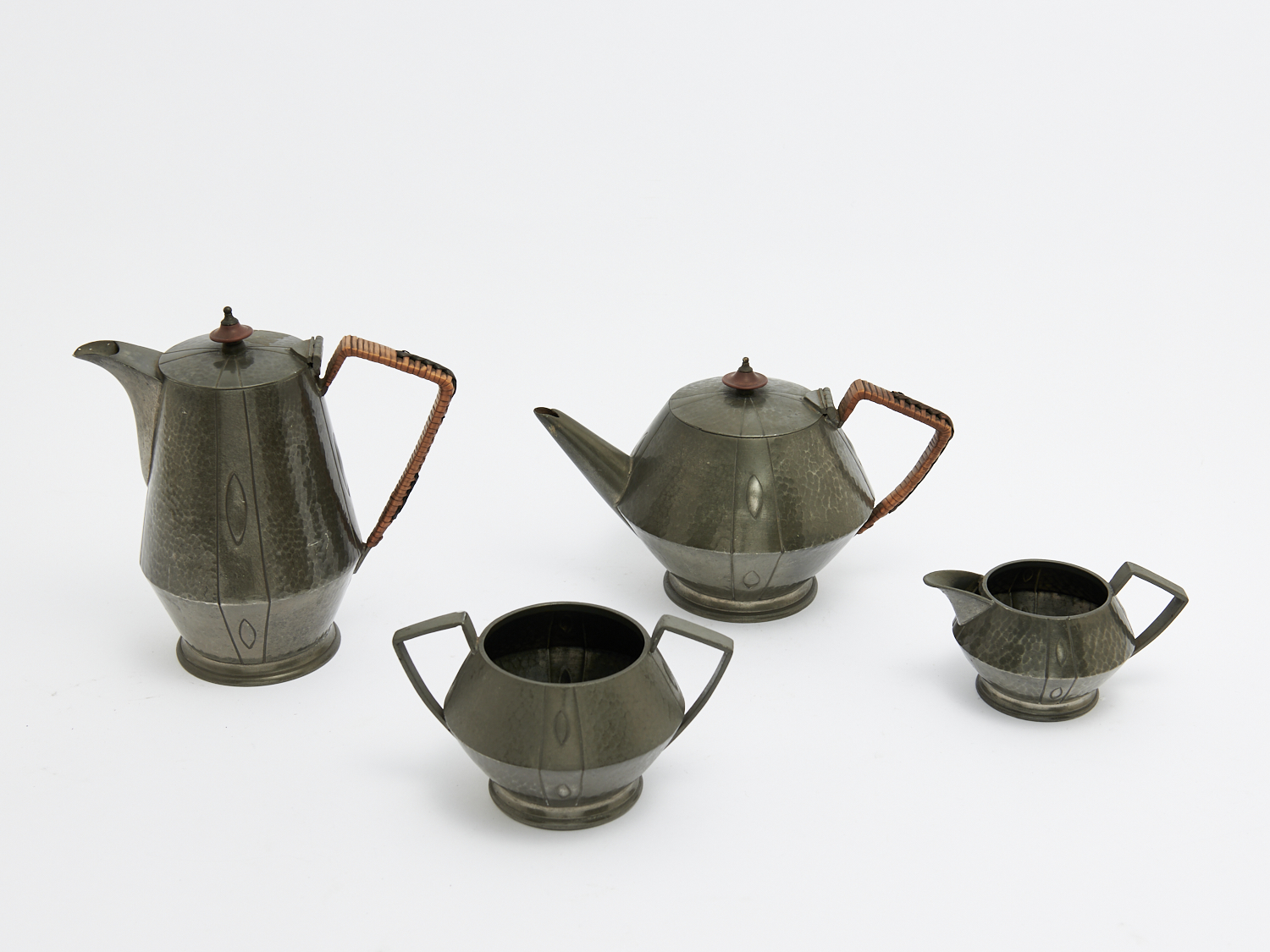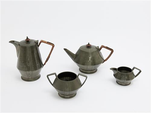 A FOUR PIECE ART NOUVEAU ENGLISH PARK DESIGN PEWTER TEA AND COFFEE SET BY J B & CO. H.21CM (TALLEST), LEONARD JOEL LOCAL DELIVERY: SMALL