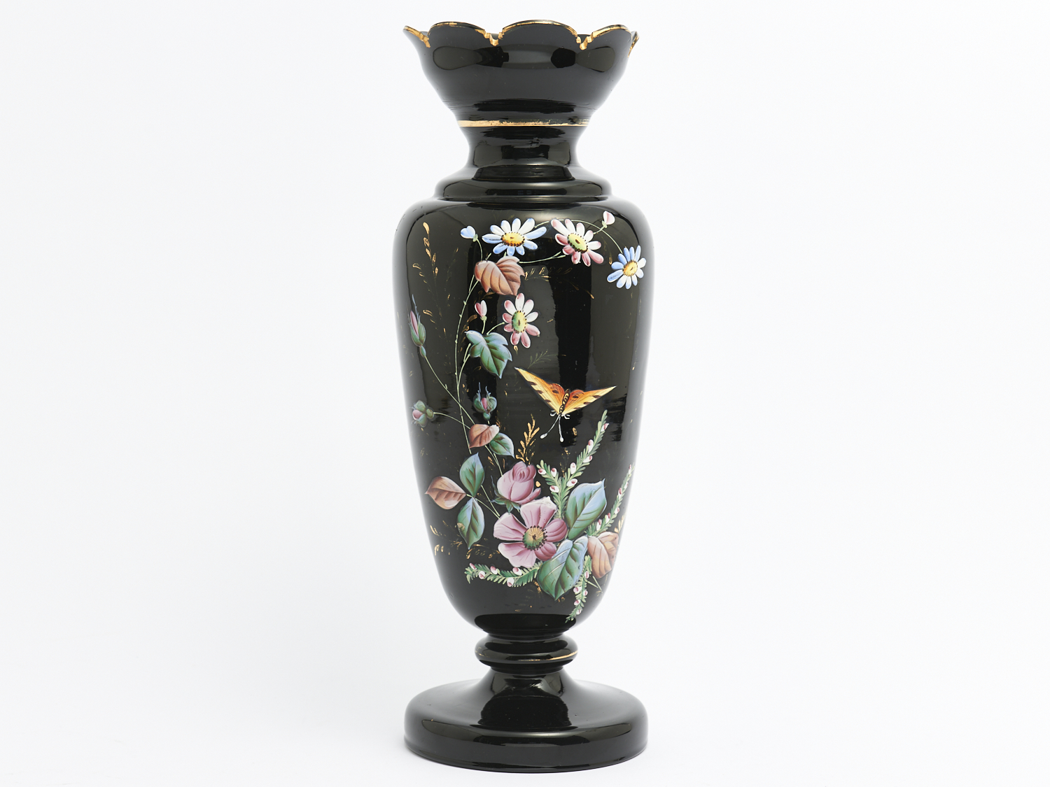 AN OVERSIZED 19TH-CENTURY BLACK GLASS HAND PAINTED ALTAR VASE H.41CM, LEONARD JOEL LOCAL DELIVERY: SMALL