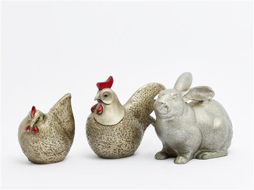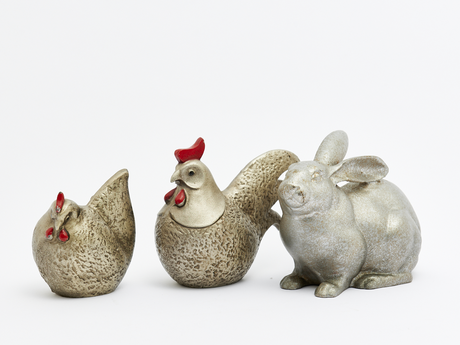 A GROUP OF VINTAGE ANODISED CAST-IRON ROOSTERS AND RABBIT FIGURE H.14CM (TALLEST), LEONARD JOEL LOCAL DELIVERY: SMALL, LEONARD JOEL LOCAL DELIVERY: SMALL