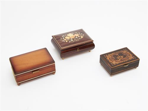 THREE VINTAGE AND ANTIQUE INLAID MUSICAL JEWEL BOXES W.16.5CM (WIDEST), LEONARD JOEL LOCAL DELIVERY: SMALL