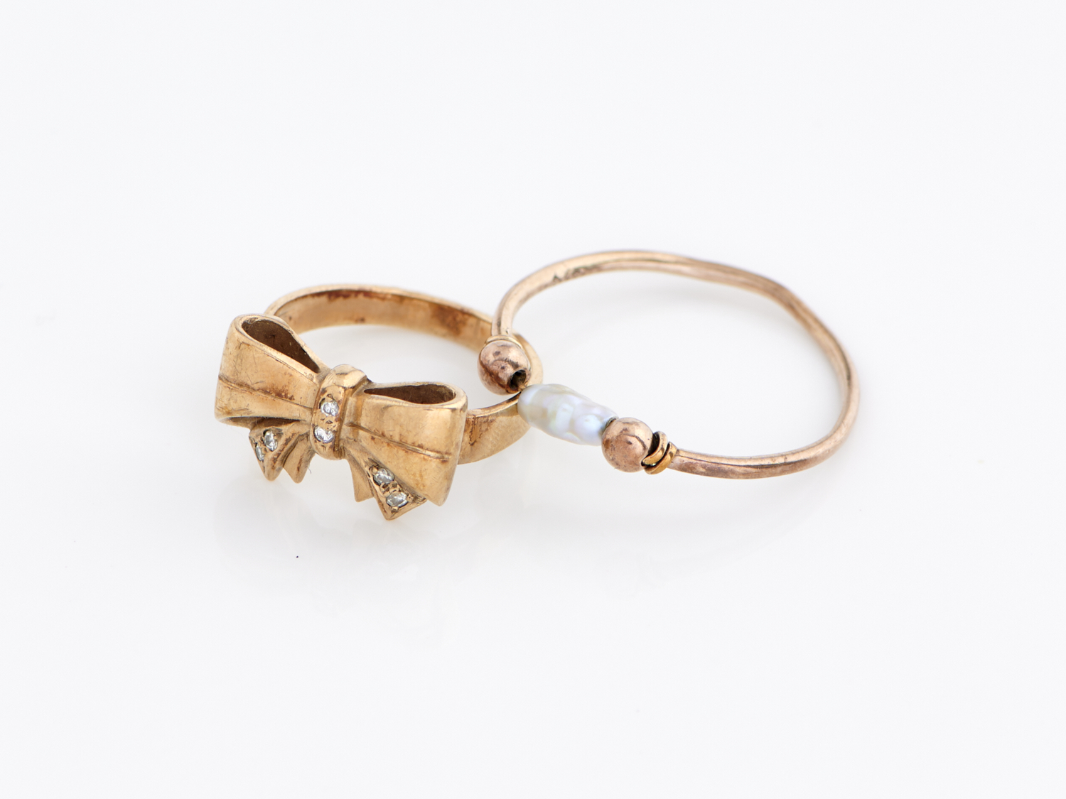 A DIAMOND SET BOW RING IN 9CT GOLD, RING SIZE F, TOGETHER WITH A PEARL SET RING IN 9CT GOLD, RING SIZE O, TOTAL WEIGHT 3.2GMS