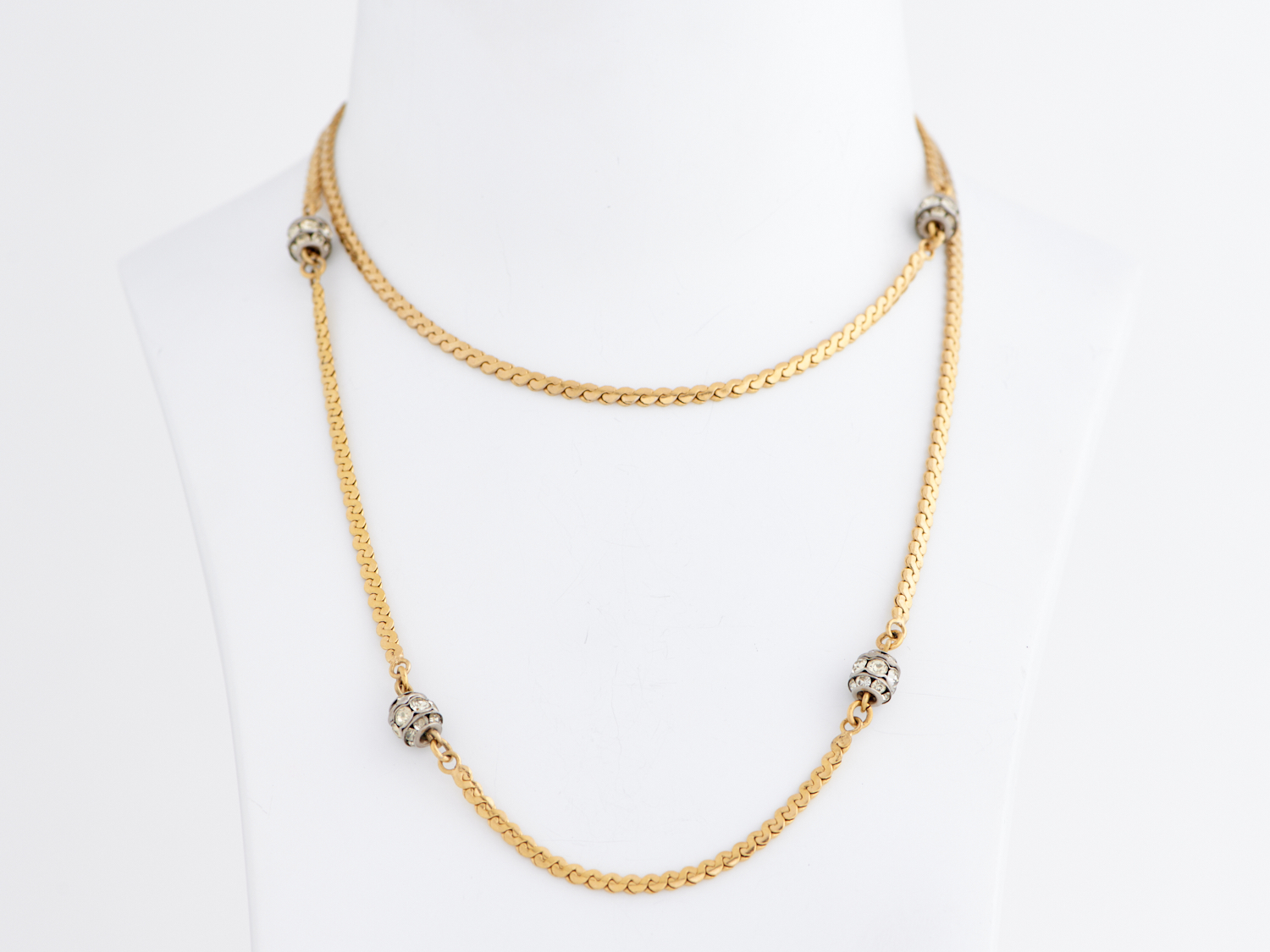 CHRISTIAN DIOR, A LONG VINTAGE CHAIN IN GOLD PLATED METAL, FEATURING CRYSTAL BALL SPACERS, LENGTH 855MM
