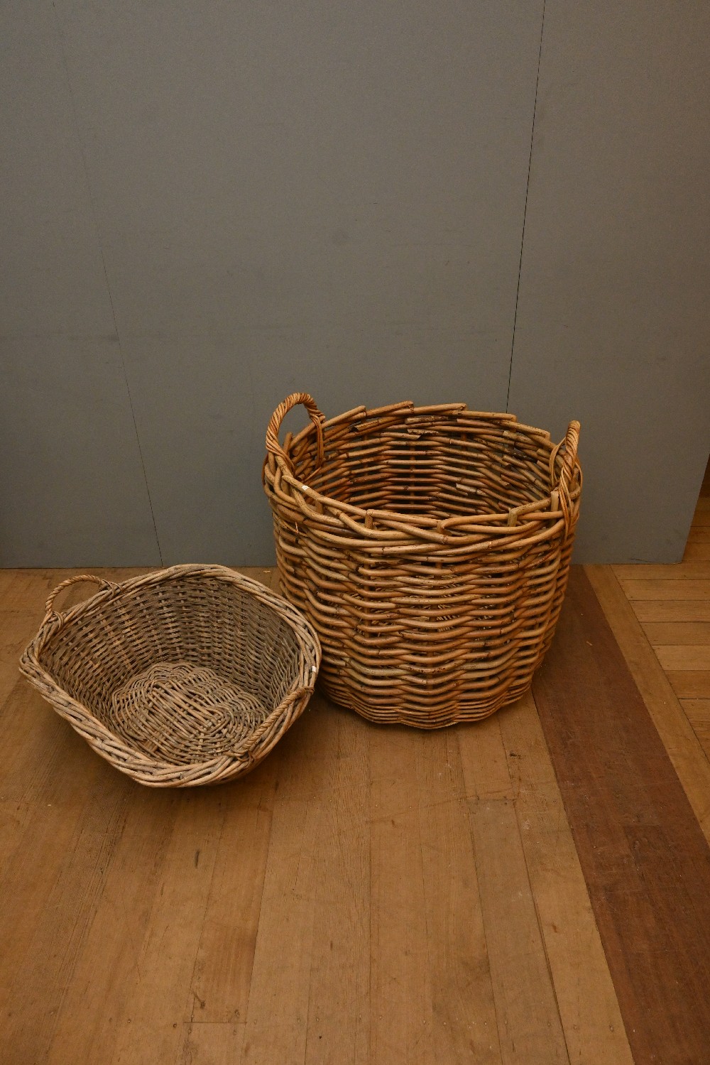 A WOVEN CANE AND BAMBOO CLOTHES BASKET AND ENORMOUS CIRCULAR LAUNDRY BASKET (A/F) (72H X 75DIA CM) (LEONARD JOEL DELIVERY SIZE: X-LARGE)