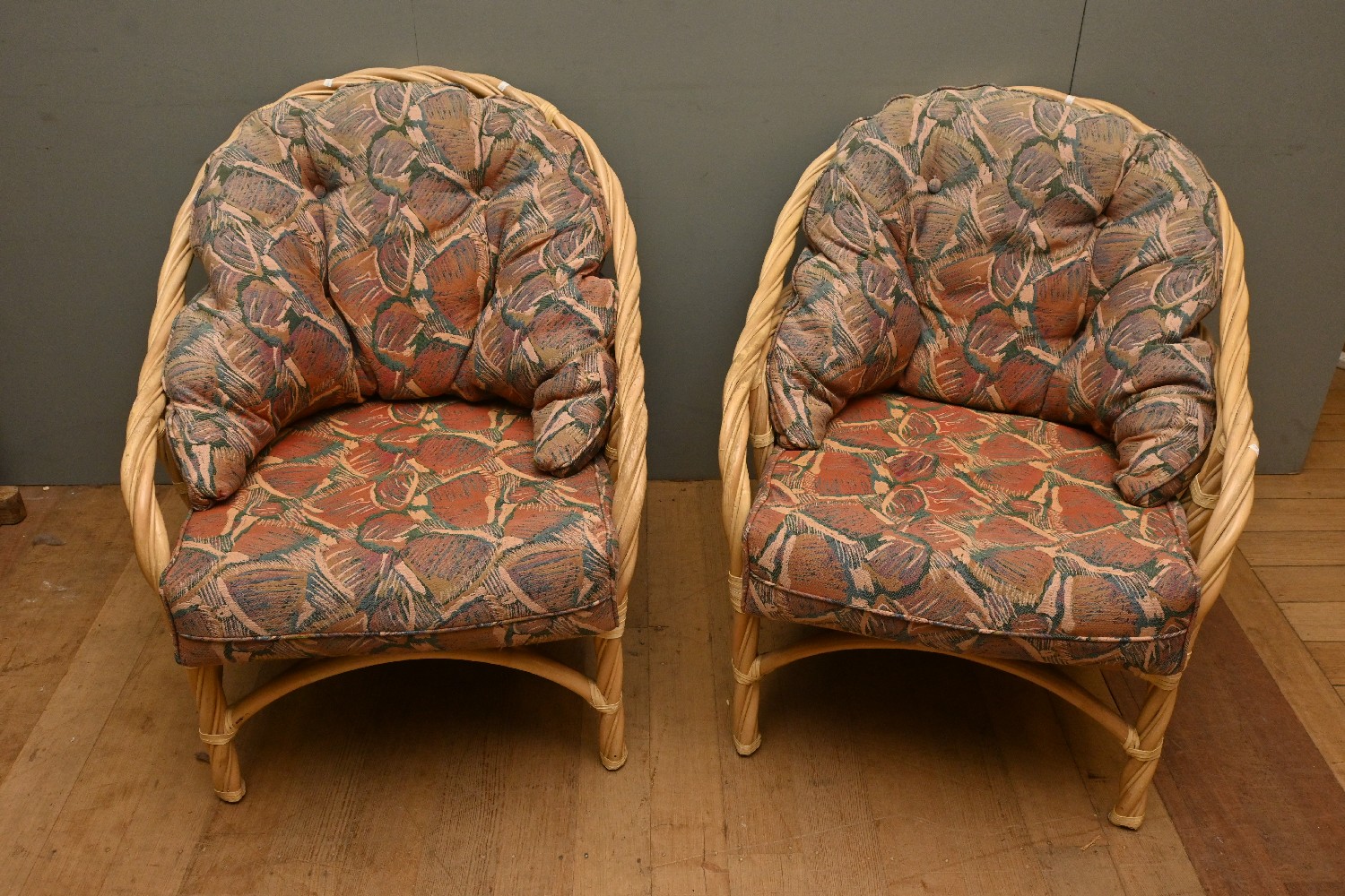 A PAIR OF VINTAGE WOVEN CANE LOUNGE CHAIRS WITH CUSHIONS (A/F) (80H X 73W X 90D CM) (LEONARD JOEL DELIVERY SIZE: X-LARGE)