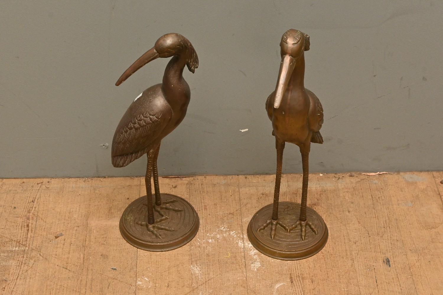 A PAIR OF BRONZE STANDING STORK FIGURES (52H CM) (LEONARD JOEL DELIVERY SIZE: LARGE)