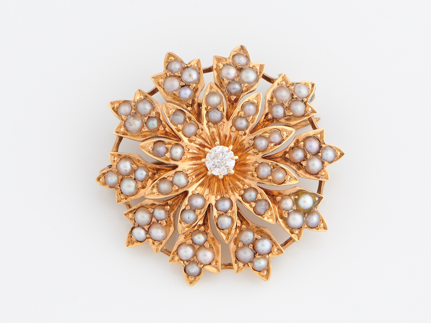 A SEED PEARL AND DIAMOND ENHANCER IN 18CT GOLD, DIAMETER 25MM, 7.6GMS