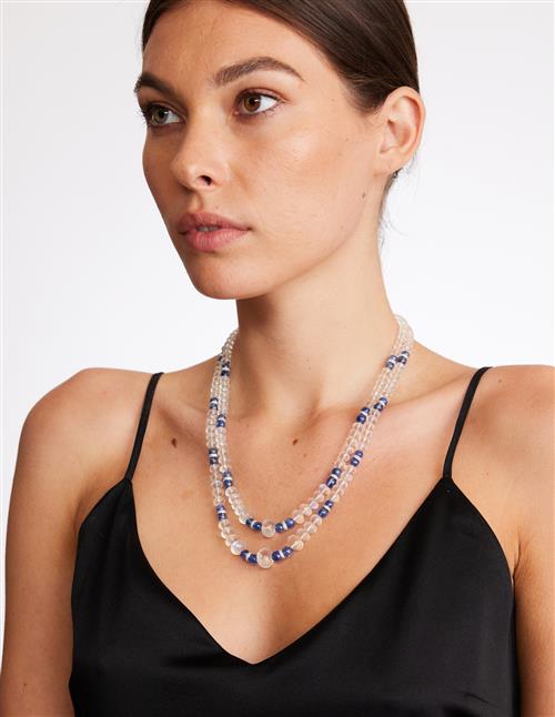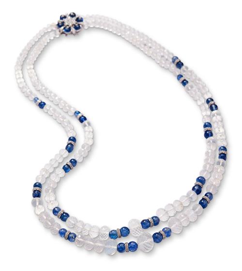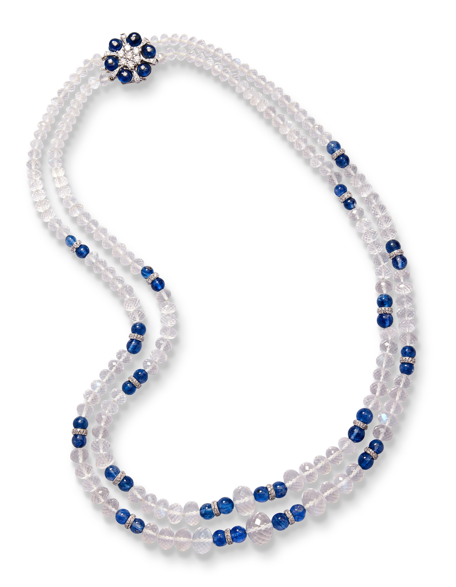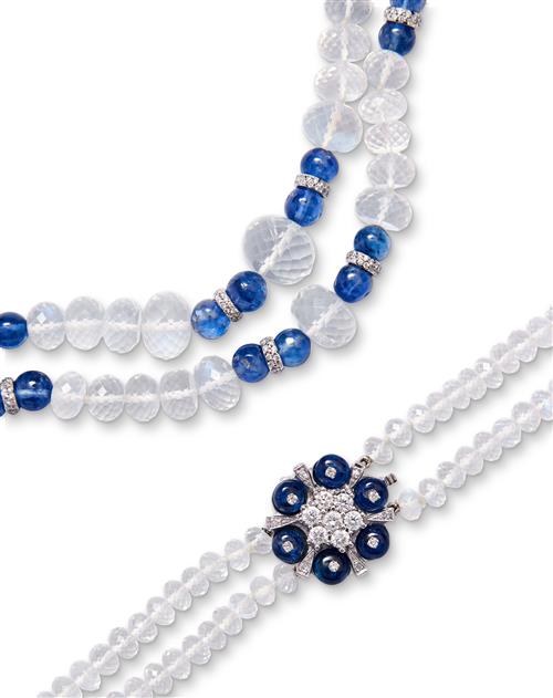 Composed of two lines of rose-cut spheroid-shaped moonstone beads decorated at intervals with round sapphire beads between rondel spacers pavé-set with brilliant-cut diamonds, completed by a 14ct white gold clasp modelled as a flowerhead decorated with sapphire and diamonds, inner circumference 500mm.