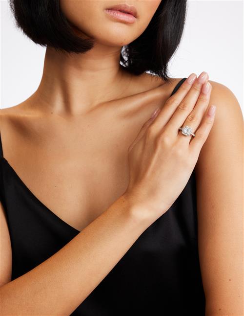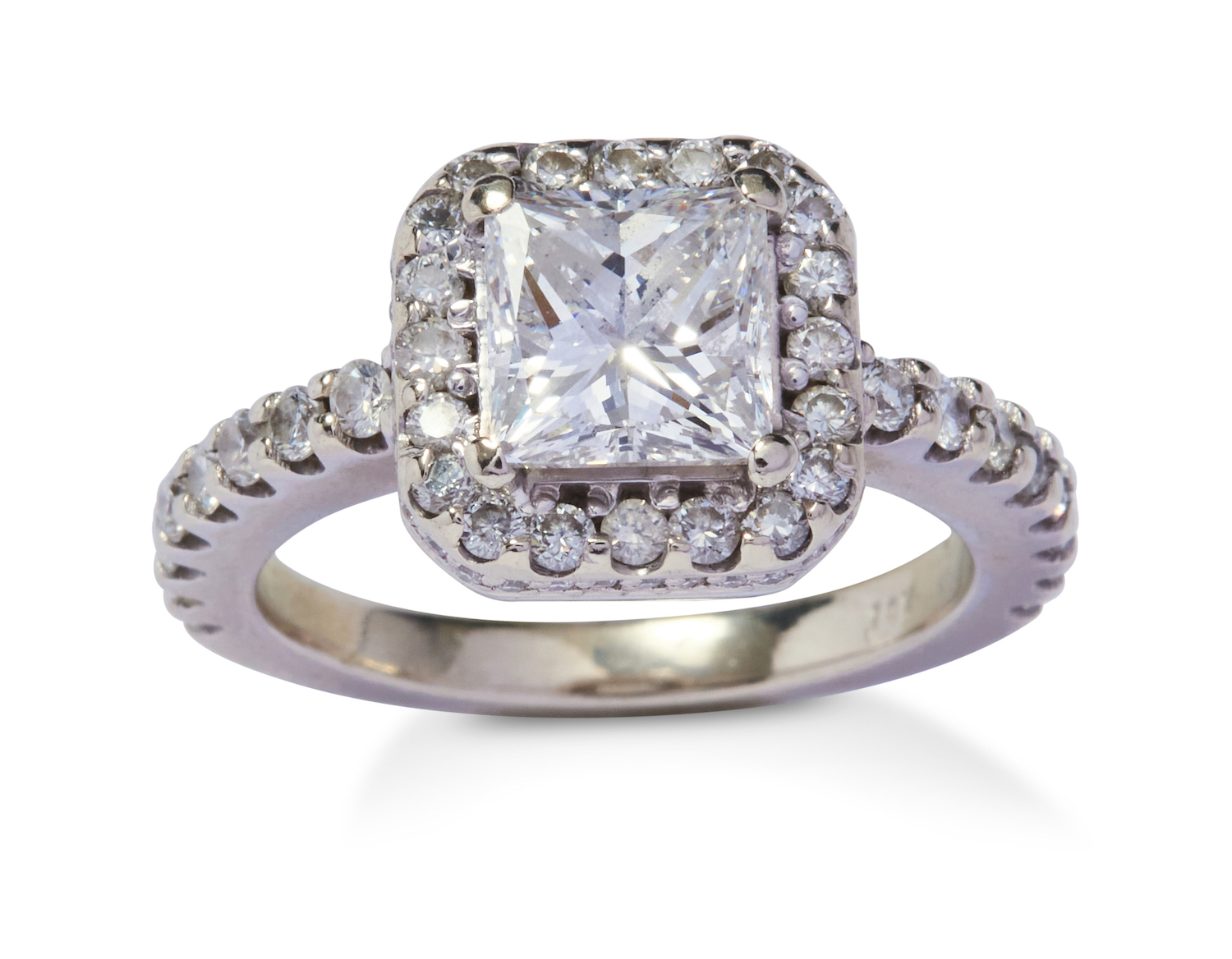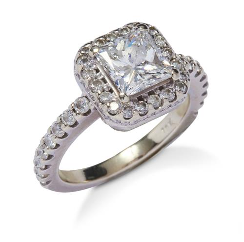 Of cluster design, centring a claw-set square modified brilliant-cut diamond weighing 1.72 carats, framed by a halo of brilliant-cut diamonds to pavé-set shoulders, the small diamonds together weighing approximately 1.05 carats, mounted in 14ct white gold, size L.