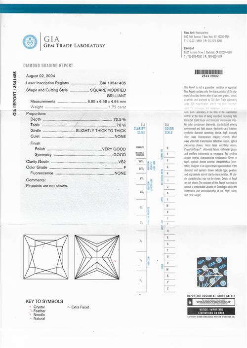 Accompanied by a GIA report numbered 13541485, dated 2 August 2004, stating that the 1.72 carat diamond is natural, F colour, VS2 clarity.