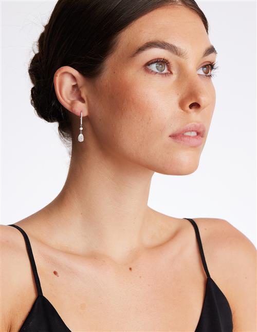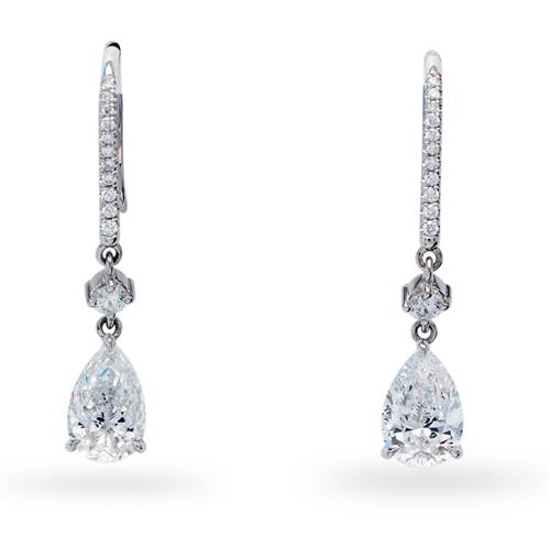 Each terminating on a claw-set pear-shaped diamond swing drop weighing 1.50 carats and 1.50 carats respectively, surmounted by an ear wire pavé-set to the front with brilliant-cut diamonds between a claw-set brilliant-cut diamond connector, the small diamonds together weighing approximately 0.20 carats, mounted in 18ct white gold, length 33mm, shepherd hook fittings.