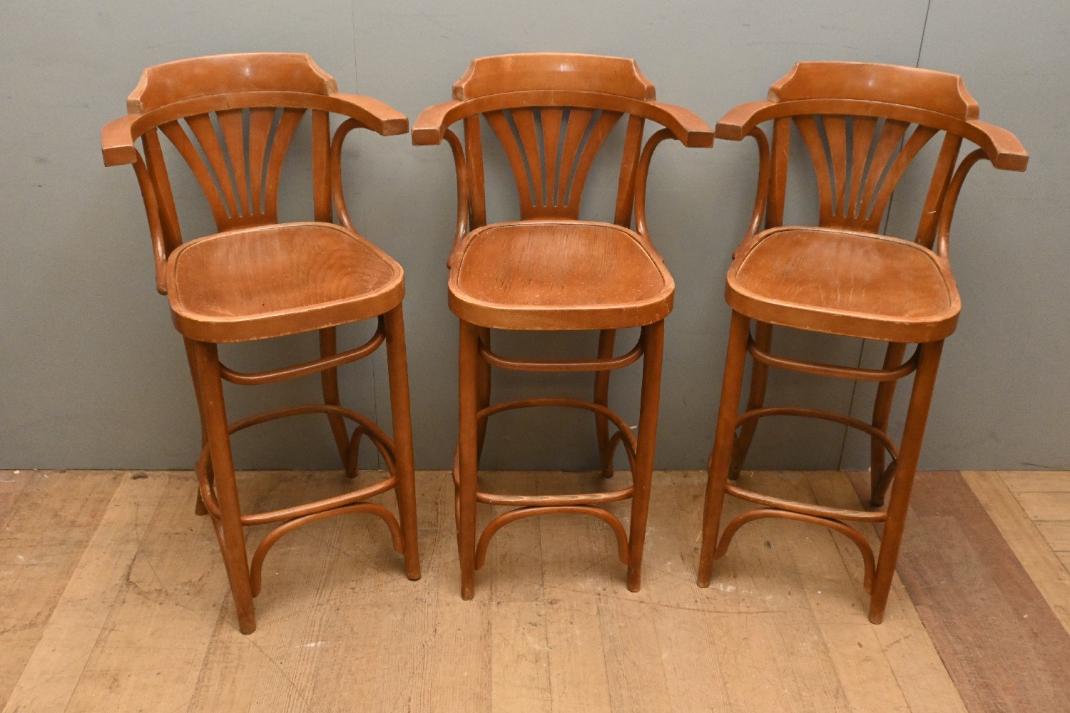A SET OF THREE BENTWOOD BARSTOOLS (A/F) (100H X 53W X 50D CM) (LEONARD JOEL DELIVERY SIZE: X-LARGE)
