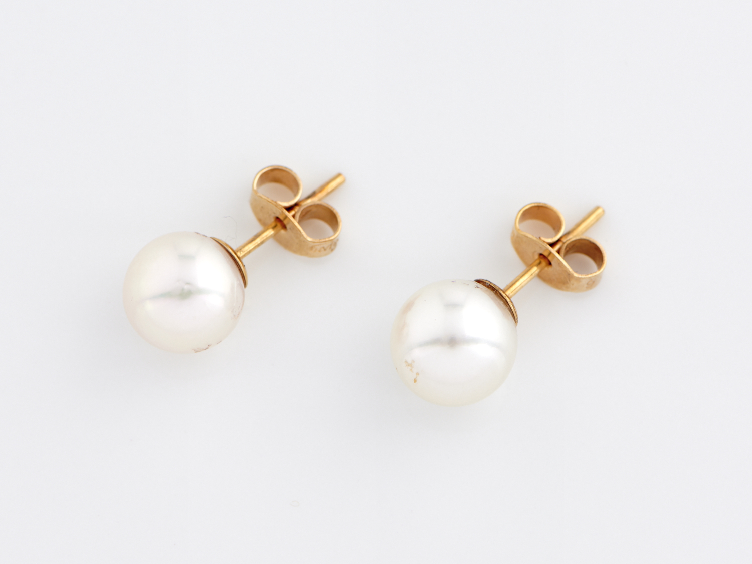 A PAIR OF AKOYA CULTURED PEARL EARRINGS IN 9CT GOLD, TO POST AND BUTTERFLY FITTINGS, THE PEARLS MEASURING APPOXIMATELY 8MM