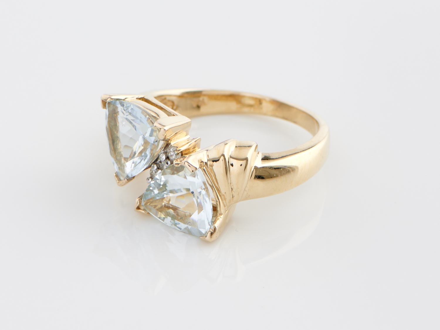 AN AQUAMARINE SET RING IN 14CT GOLD, RING SIZE L 1/2,