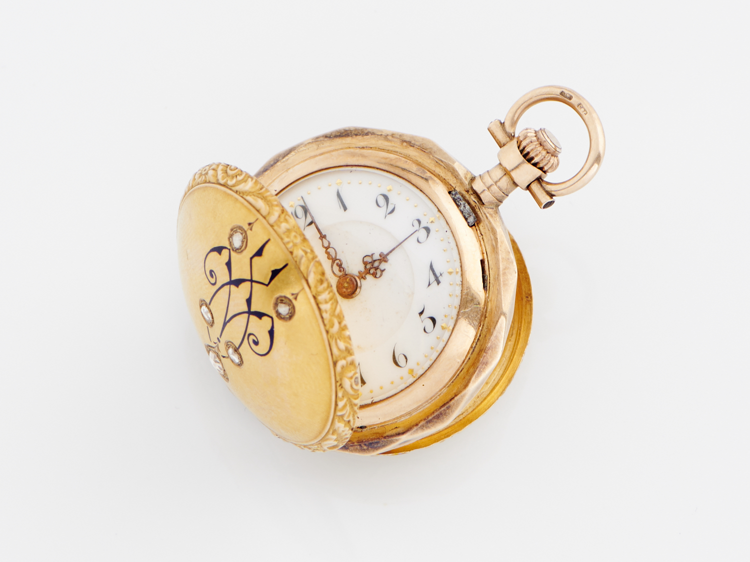 A ROSE-CUT DIAMOND SET FOB WATCH CASED IN 14CT GOLD, 18.37GMS