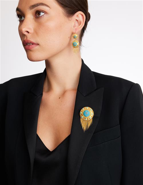 Comprising: a target brooch centring a celestial motif claw-set with a rose-cut diamond framed by a cluster of circular turquoise beads further framed by four collet set oval-shaped turquoise between applied rope twist and granulation accents terminating on a fringe of cones between cylindrical links, mounted in 15ct gold, diameter 35mm, length 66mm; and a pair of pendant earrings en suite, width 19mm, length 58mm, wire fittings (2).