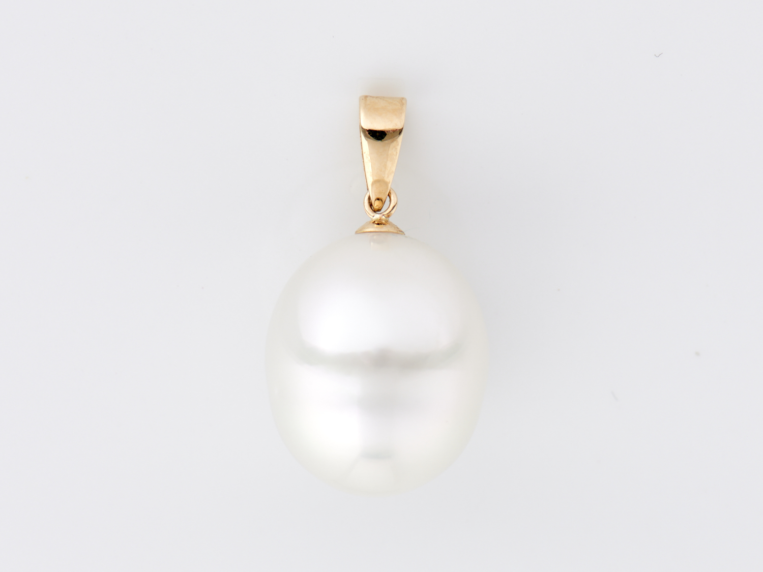 A WHITE SOUTH SEA PEARL PENDANT TO A BAIL IN 9CT GOLD, THE PEARL MEASURING 14MM