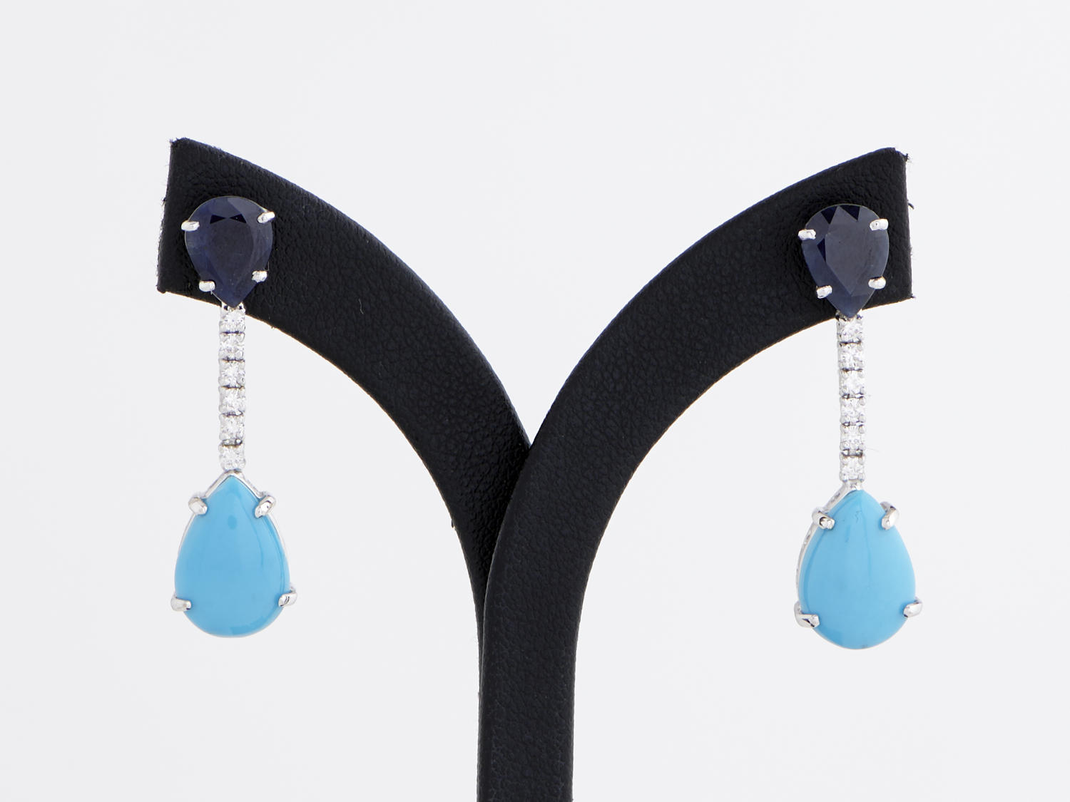 A PAIR OF SAPPHIRE, TURQUOISE AND DIAMOND EARRINGS IN 18CT WHITE GOLD, TO POST AND BUTTERFLY FITTINGS, THE SAPPHIRES TOTALLING 3.60CT, THE TURQUOISE TOTALLING 5.74CT, THE DIAMONDS ESTIMATED AT 0.26CT, LENGTH 35MM