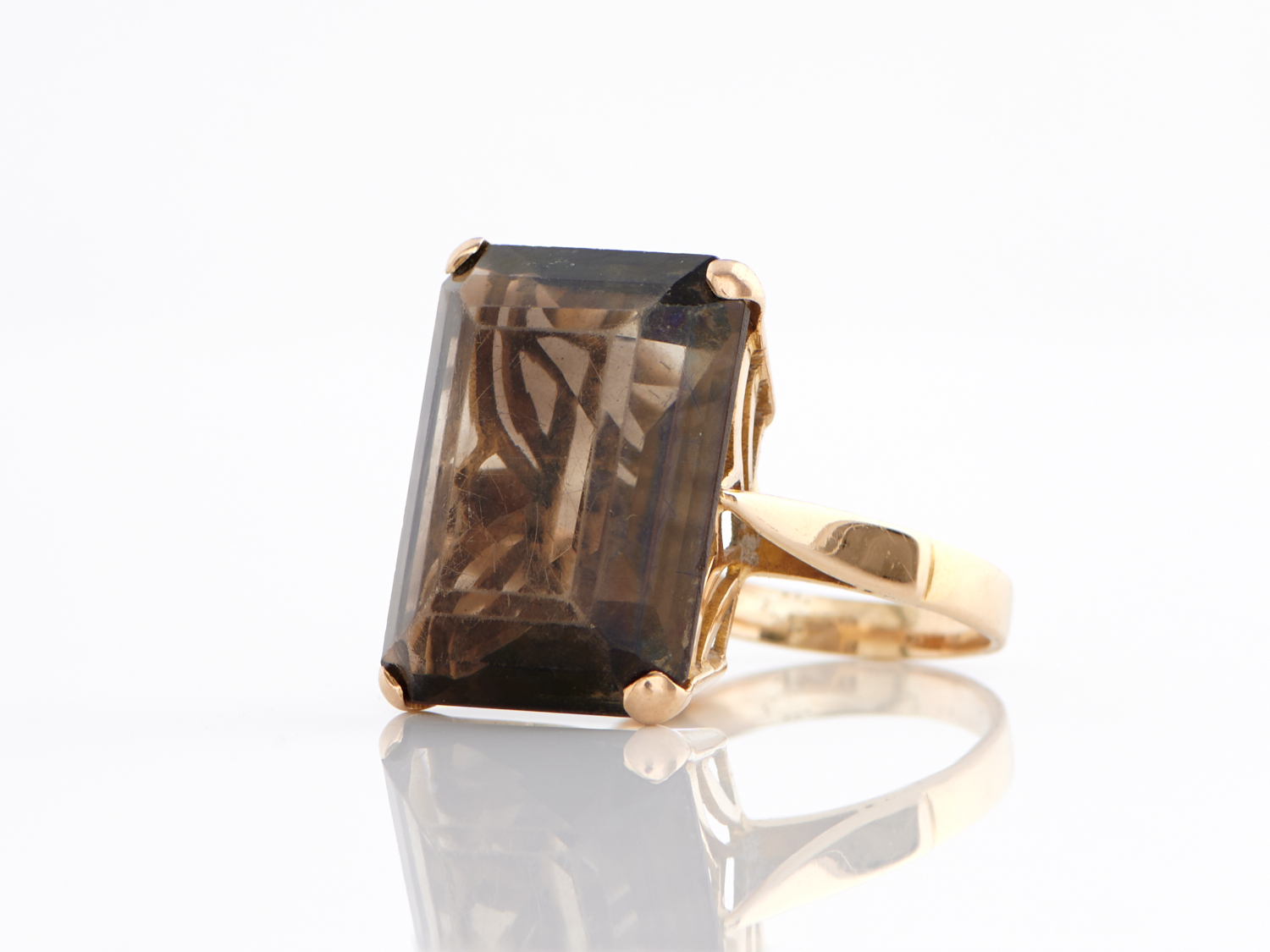 A SMOKY QUARTZ SET DRESS RING IN 18CT GOLD, RING SIZE Q, 8.6GMS