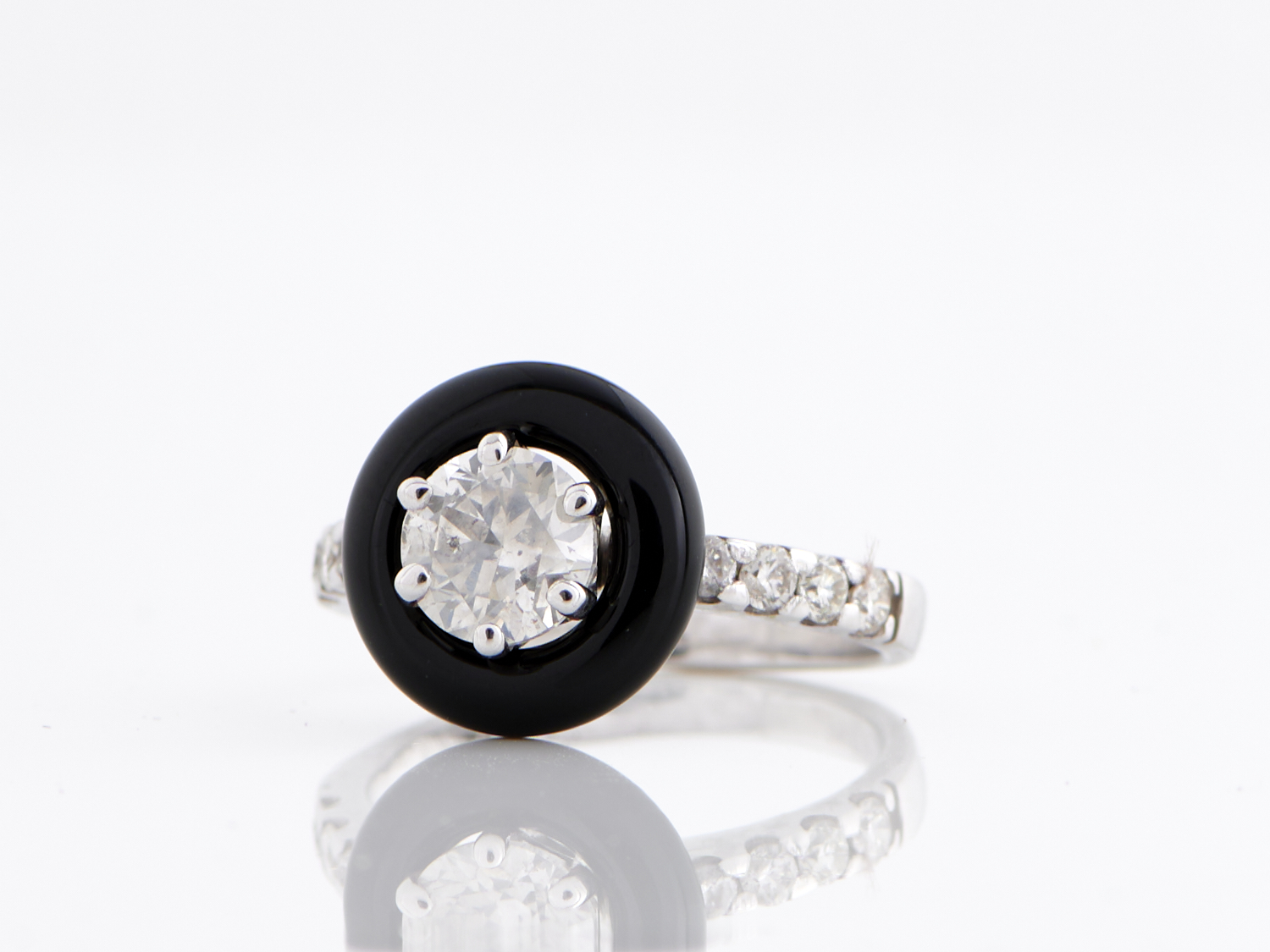 A SOLITAIRE DIAMOND AND ONYX RING IN 18CT WHITE GOLD, THE DIAMOND OF 1.06CT, WITH AN ONYX HALO OF 0.25CT, RING SIZE L