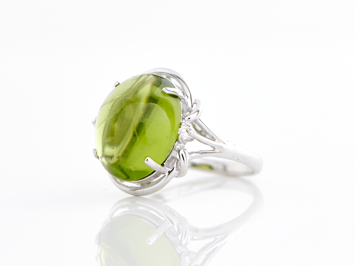 A CABOCHON PERIDOT AND DIAMOND RING IN 18CT WHITE GOLD, THE PERIDOT WEIGHING 10.85CT WITH DIAMONDS TOTALLING 0.04CT, SIZE O