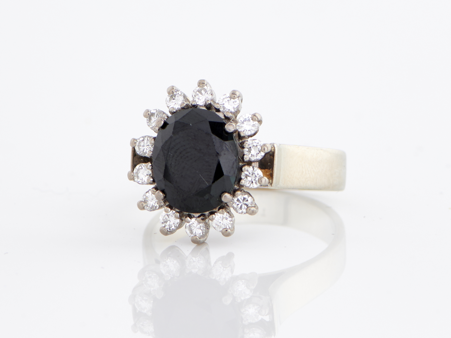 A SAPPHIRE AND DIAMOND SET RING IN 18CT WHITE GOLD, RING SIZE Q, 8.1GMS